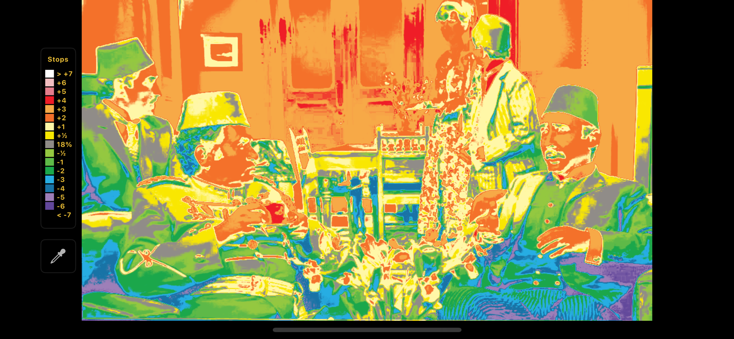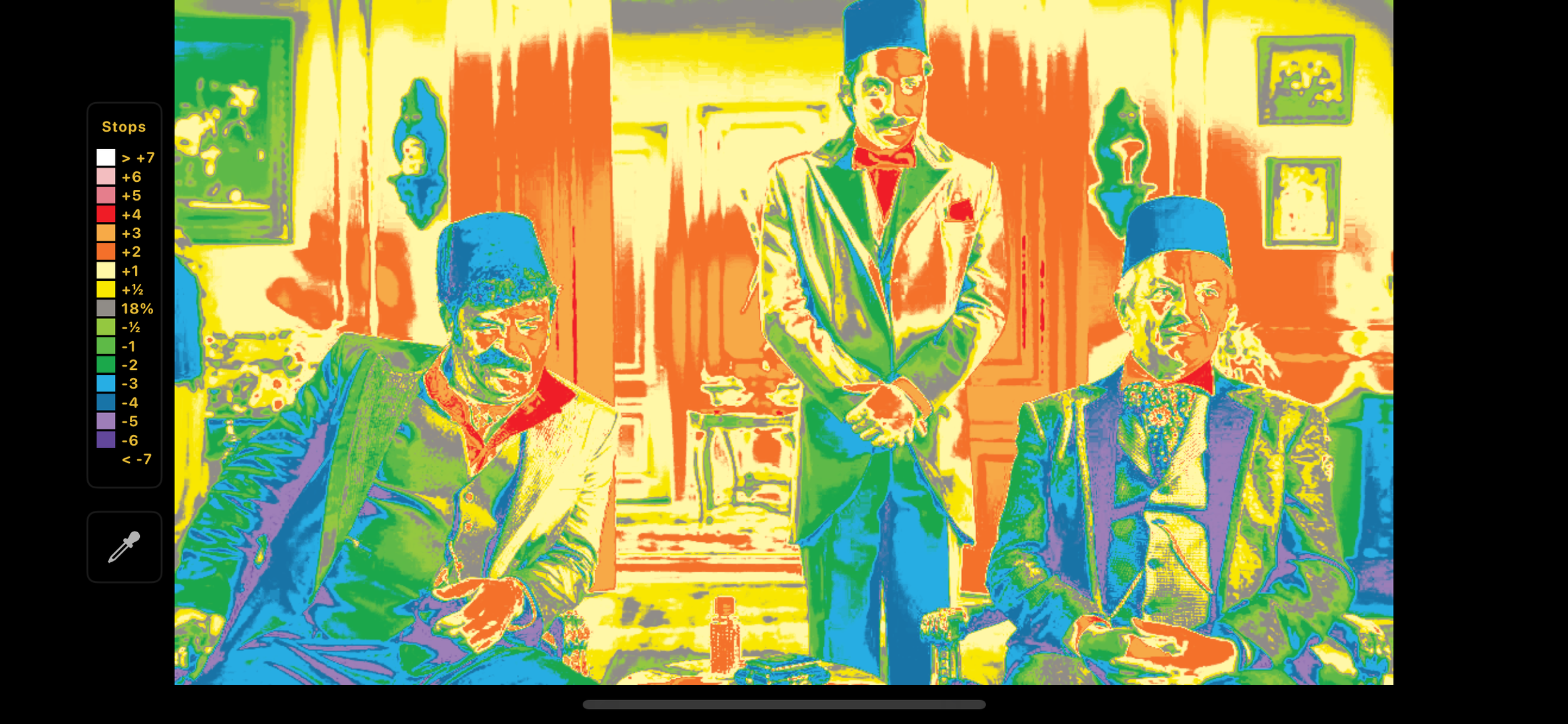 Erşan Kuneri 2. Sezon ‘Şeker Paşa’ bölümünden bir kare, EL-Zone sistemiyle pozlama değerlerinin renk haritası üzerinden analiz edilmiş görüntü.