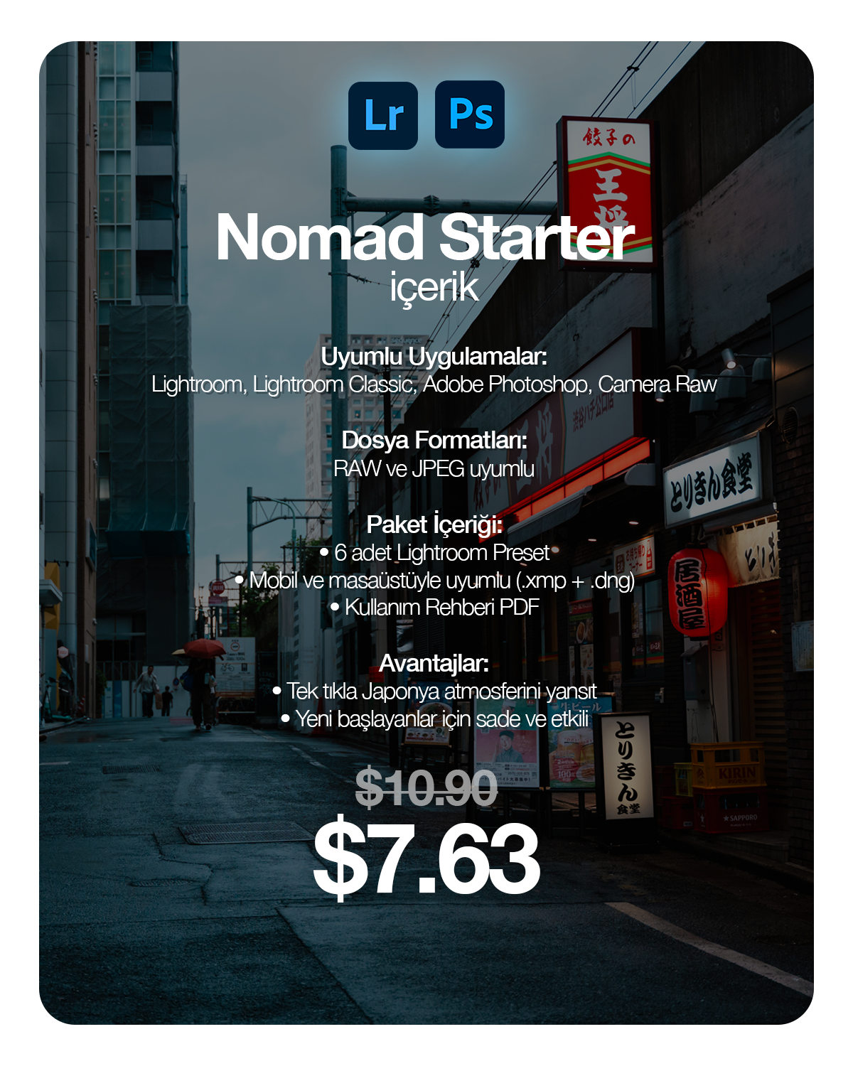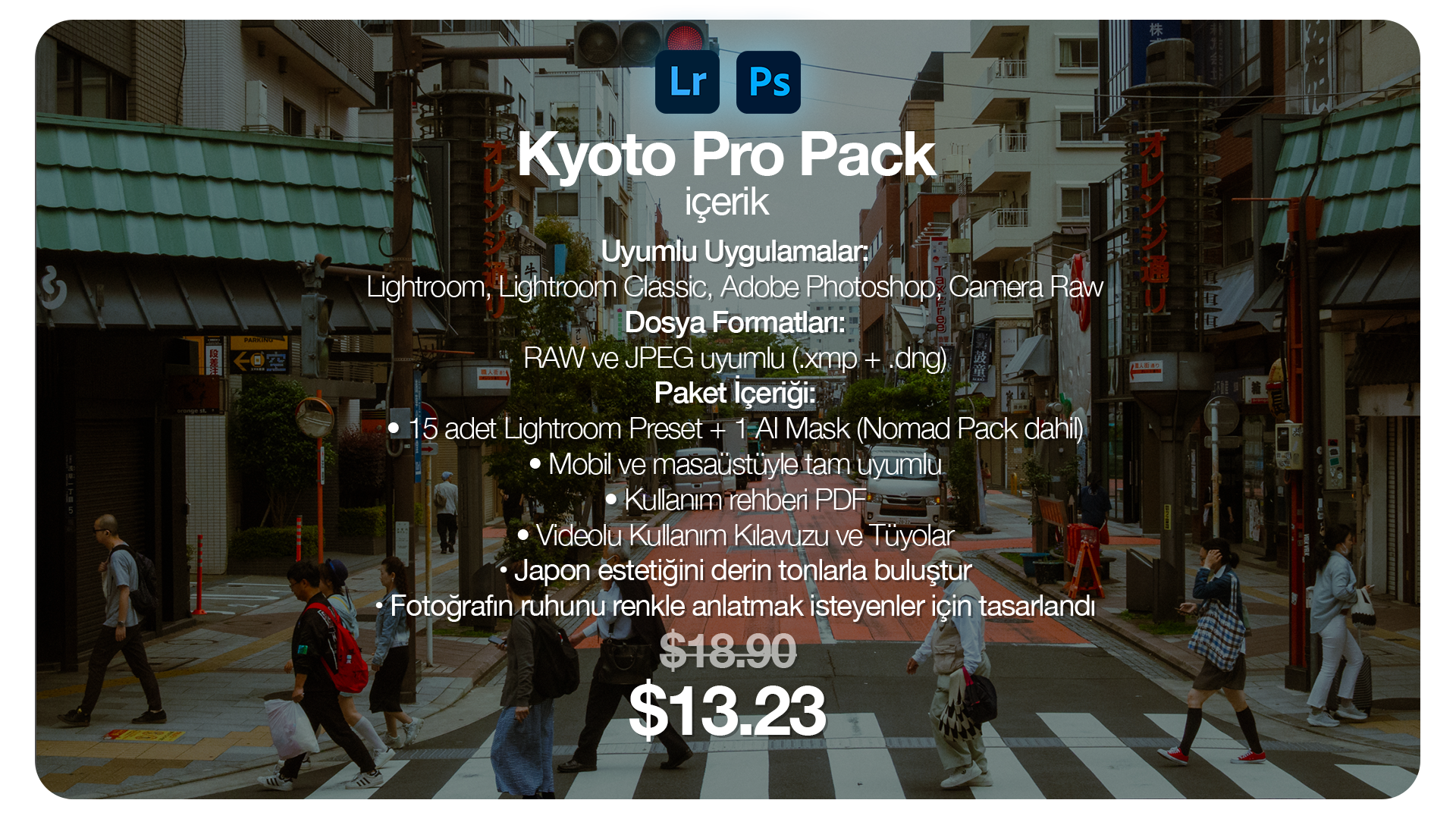 Japonya sokaklarında dolaşırken çektiğim fotoğraflar, bu preset’lerin temelini oluşturdu. Bu videoda, yalnızca hangi kareleri yakaladığımı değil, o karelere nasıl baktığımı da anlattım. Kompozisyon tercihlerimden edit sürecine kadar uzanan bu küçük fotoğraf yolculuğu, hem görsel bir ilham kaynağı, hem de bu paketin arkasındaki yaklaşımı daha iyi anlaman için bir davet. Merak ettiğin her şey, bu videoda saklı.